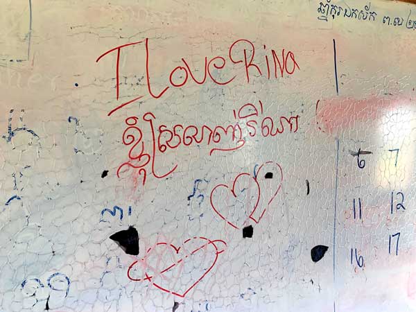 最後の週に訪れたのはアンクロン村の中学校です。この村での仕事も同じような内容でしたが、最大の違いはこの村のこどもたちとは、わずかながら言葉を交わすことが出来たことです。それまでに訪れた学校でも、こどもたちと触れ合う機会は多くありましたが、いずれの学校でも言葉はほとんど通じませんでした。お互いの言語を理解できず、困難なことは多々ありましたが、それでも私はこどもたちや現地の人々と共に素晴らしい時間を過ごすことができました。メッセージを伝える際に非言語的コミュニケーションは役立ちましたが、人と人とが繋がるときにおいては、互いを知りたい、理解したいという気持ちが最も重要な要素なのではないかと考えています。私たちが校庭などで作業をしていると、こどもたちはいつも手伝ってくれました。なにをするにも楽しそうな彼らの姿から学ぶことは多くありました。こどもたちと一緒に多くの時間を過ごすことで、私は自分の気持ちや感情に、より素直に向き合えるようになっていくのを感じました。共有できた時間は長くはありませんでしたが、彼らとの間になにか特別な絆が生まれたような気がします。アンクロン中学校のこどもたちはクメール語でいくつかの言葉と私の名前の書き方を教えてくれました。言葉を交わせたことにより、彼らとはさらに太い絆で結ばれたように感じました。
