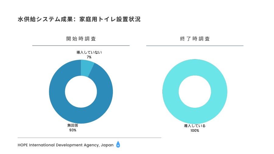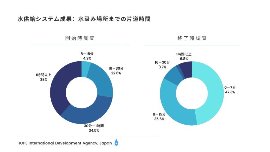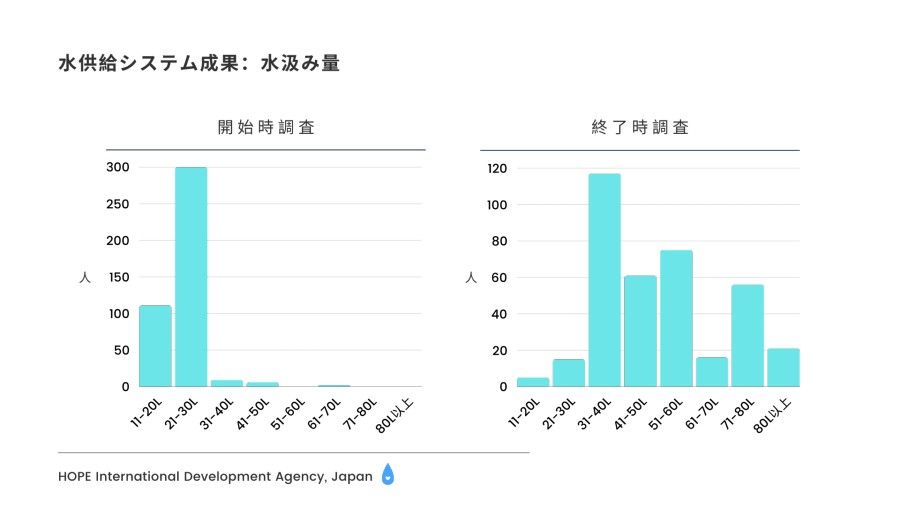本事業により合計8ヶ所の水源から8基の貯水タンク、55ヶ所の給水所を設置した結果、約12,000人の住民に安全な水を届けることができました。水汲み場所までの片道時間は、事業開始時の1時間〜1時間半から事業終了時の30分以下へと大幅に減少し、水汲み量も1日平均20-30Lから30-60Lへと増加し、住民の水へのアクセスを顕著に改善することができました。また、家庭用トイレの設置世帯数は、事業開始時の7%から事業終了時の100%となり、水供給施設の建設と同時に実施した保健衛生教育活動の成果も確認できました。