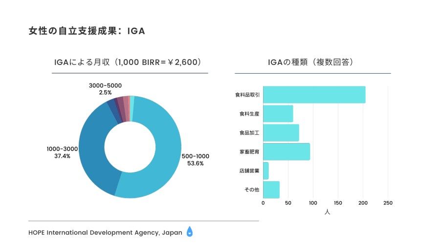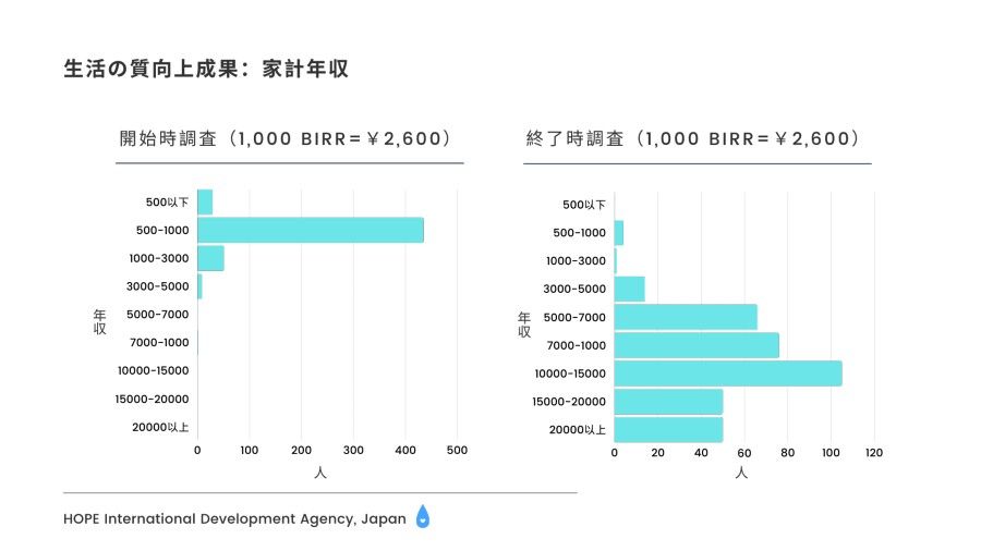 徐々にローンの金額を増やしてビジネスを拡大した結果、女性たちは月平均500-3,000エチオピアブル(約1,300-7,800円)の収入を得て、家計を支える重要な役割を果たすようになりました。世帯平均年収は、事業開始時の500-1,000ブル(約1,300-2,600円)から、事業終了時の5,000-20,000ブル(約13,000-52,000円)に大幅に増加しました。また、女性(妻)が家計の大黒柱であるという世帯は、事業開始時の2%から事業終了時の65%に変化し、1日の食事回数も多くて2回という生活から、毎日3回という生活に改善されました。家計が改善したことで小学校を中退した子どもたちが復学したり、また母親が小学校に復学したりという嬉しいニュースも聞きました。