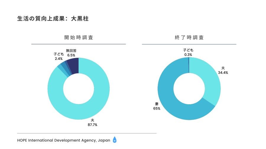 アンケートでは、事業開始後は、女性が食費や教育費などの支出を決定することができるようになり、コミュニティでは男性と肩を並べて発言し、差別を受けることはなくなったという結果を得ました。